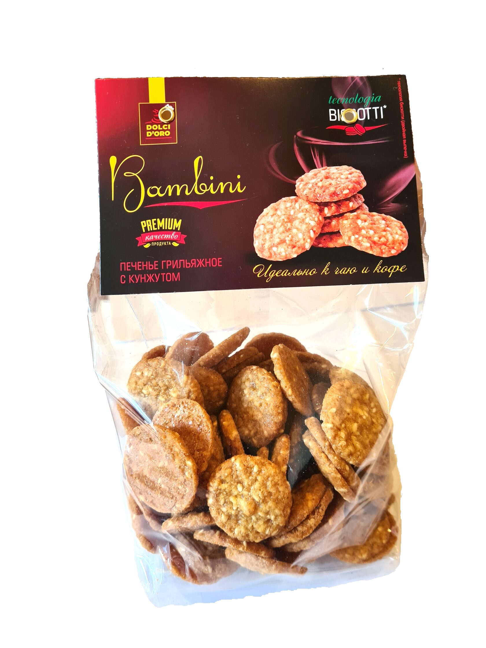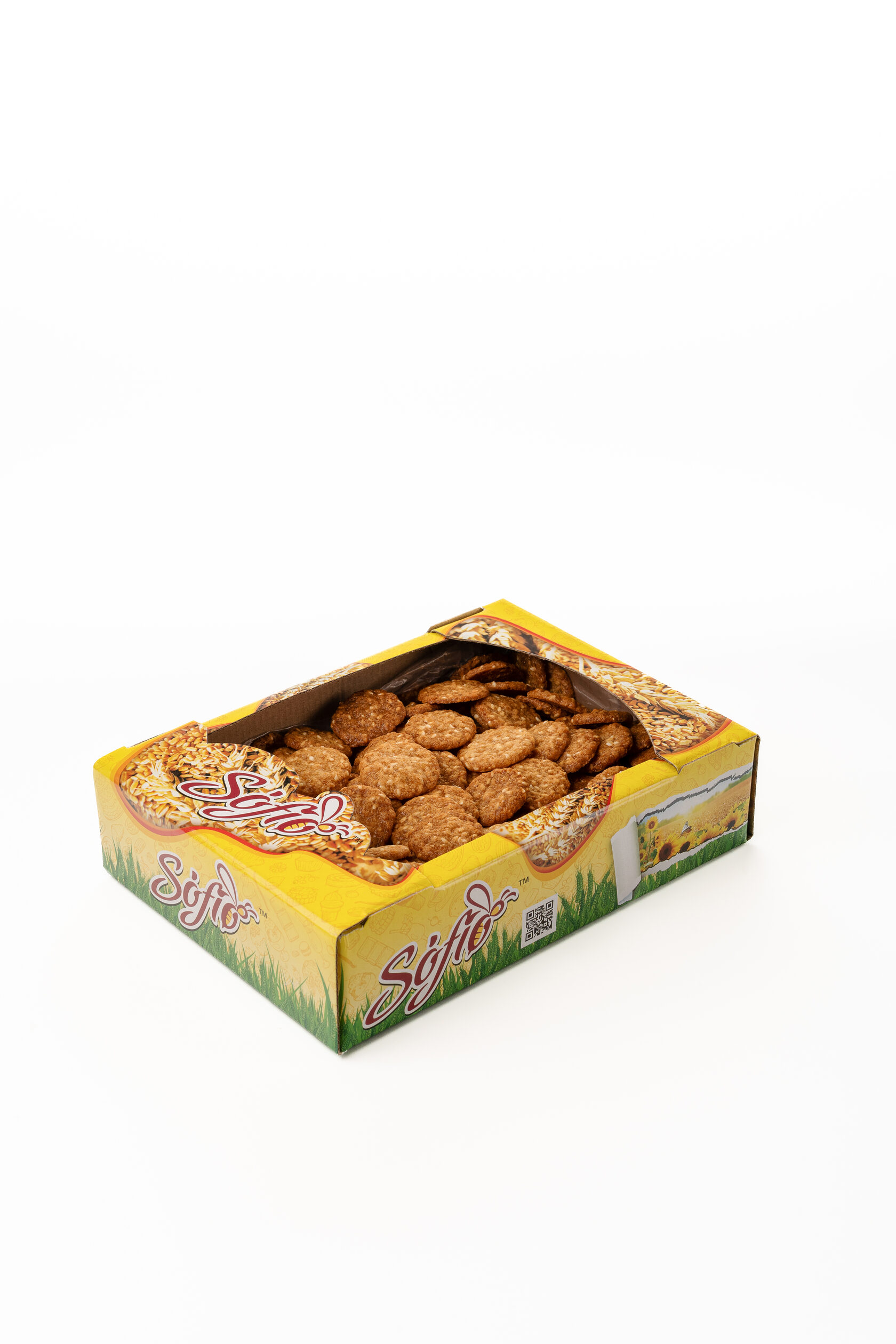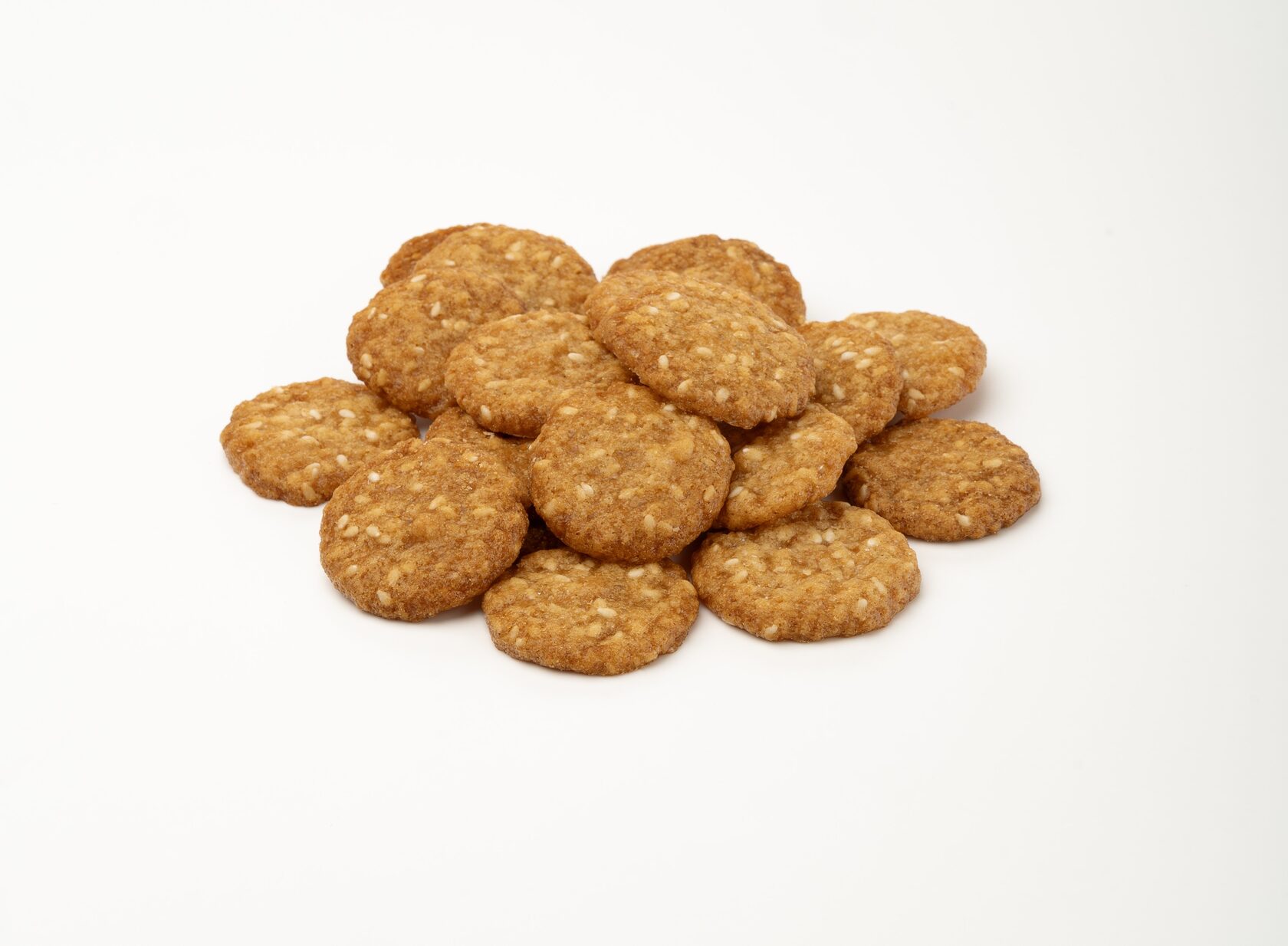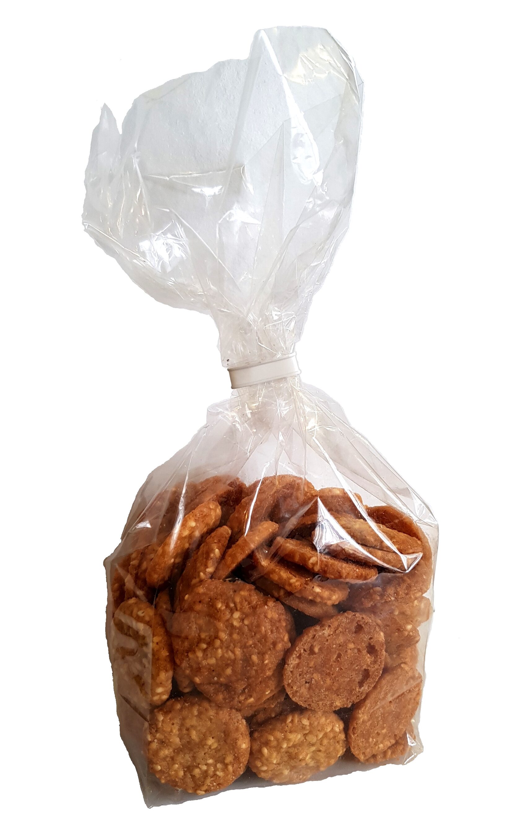 Грильяжное печенье "Софийка с кунжутом". Печенье изготовлено по технологии "бискотти" (двойная выпечка). Из полученной массы формируется печенье и выпекается второй раз. При этом сироп и мёд карамелизируются.